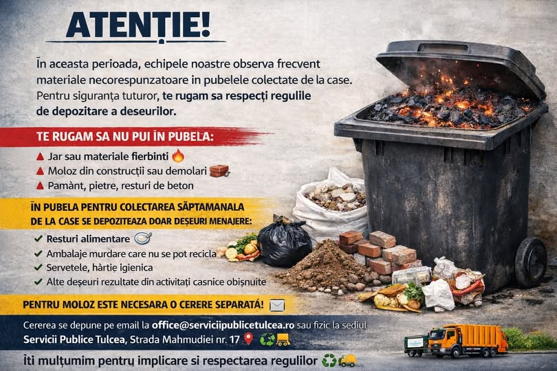 Conform avertizării emise de Servicii Publice Tulcea, cetățenii sunt rugați insistent să NU depună jar sau materiale fierbinți în pubele. De asemenea, este interzisă depozitarea molozurilor din construcții, pământului, pietrelor sau resturilor de beton. Pentru moloz, este necesară o cerere separată care poate fi trimisă pe email la office@serviciipublicetulcea.ro sau depusă fizic la sediul societății, situat pe strada Mahmudiei nr. 17.