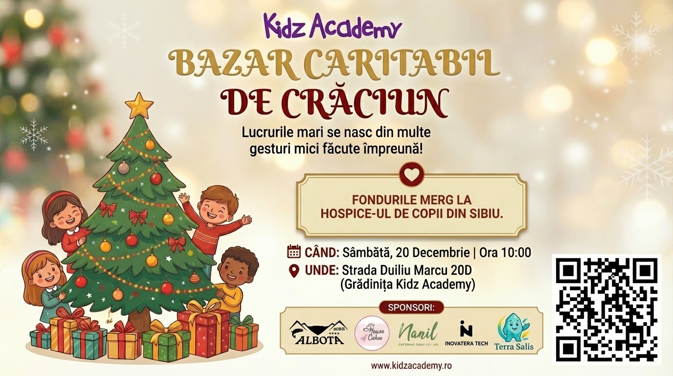 Grădinița Kidz Academy din cartierul Arhitecților susține și în acest an un bazar de Crăciun cu scop caritabil. Evenimentul va avea loc sâmbătă, 20 decembrie 2025, începând cu ora 10:00, iar fondurile strânse vor fi direcționate către Hospice-ul de copii din Sibiu.