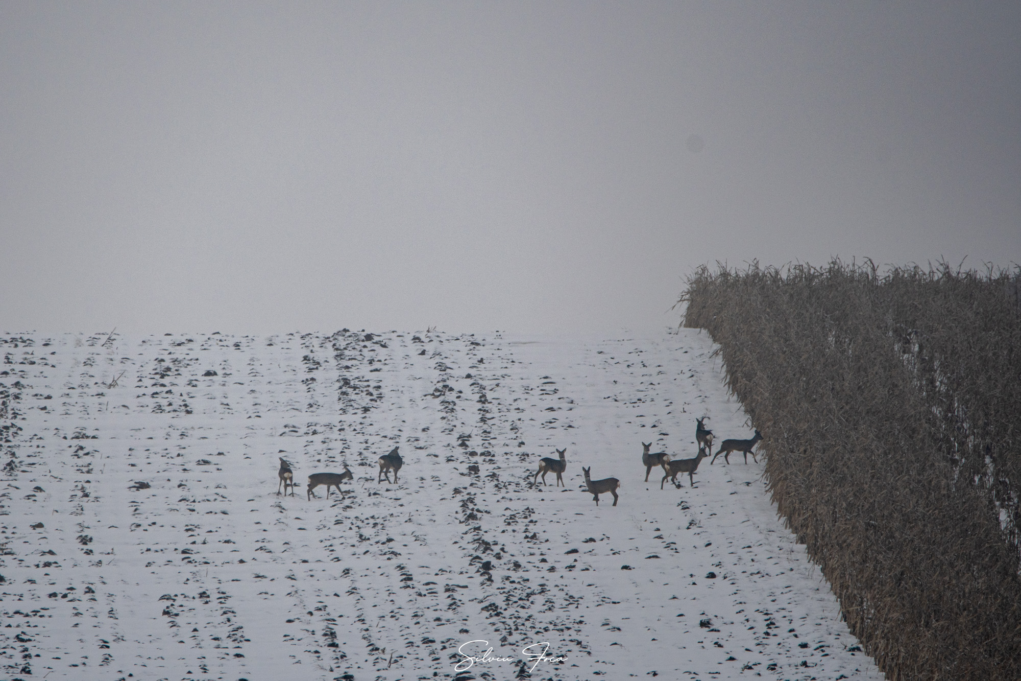 Fotografiile realizate de Silviu Foca surprind căprioarele cu o eleganță aparte, într-o atmosferă de liniște. „Într-un răgaz de ninsoare am reușit să le zăresc adunate pe un câmp în lunca Siretului”, povestește fotograful. Imaginile arată cum aceste animale au defilat fără inhibiții, făcând deliciul privitorilor.